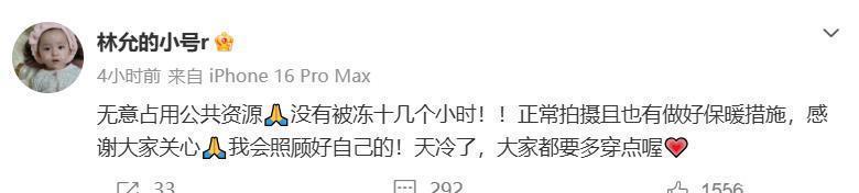1月25日,林允小号在个人社交平台回应拍戏现场吃速效救心丸:“无意占用公共资源,没有被冻十几个小时!!正常拍摄且也有做好保暖措施,感谢大家关心,我会照顾好自己的!天冷了,大家都要多穿点。”