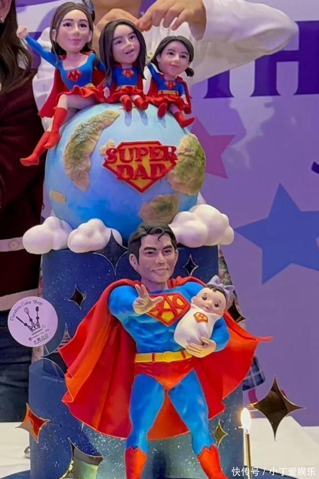 蛋糕的细节也很有意思。一家人穿着超人服装,爸爸郭富城站在下面,抱着最小的宝宝,妈妈和两个姐姐坐在星球上。这个设计,似乎也在暗示,爸爸是家里的顶梁柱,是保护神。而作为妻子的方媛,需要做的就是和女儿们一起,仰望着他,簇拥着他。